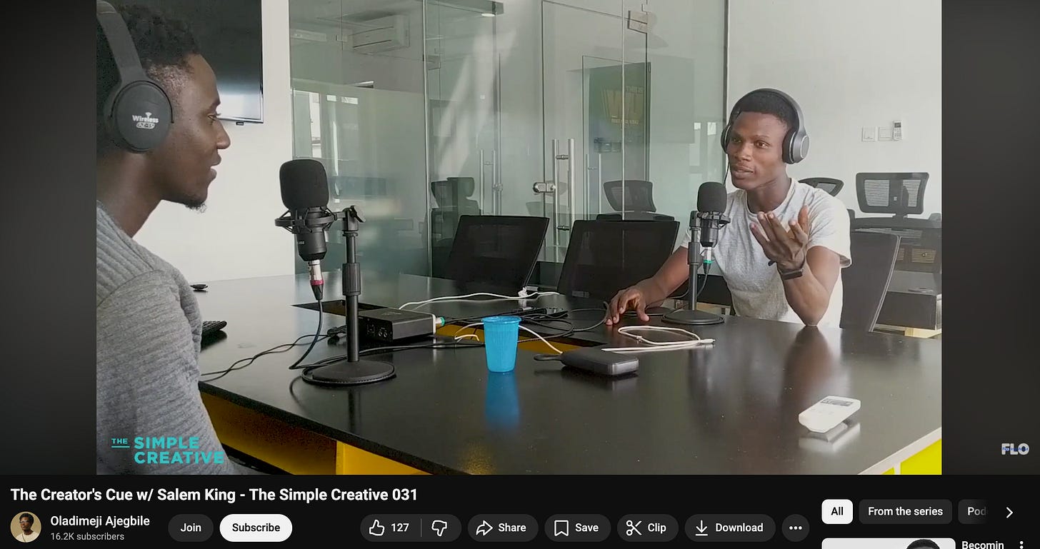 Salem King, who happened to be one of the creators whose content made me realise that being cringe at the start of your career is the best way to grow, agreed to come on my podcast. He lived in Abuja but was going to be in Lagos briefly, so we scheduled it. I travelled from Ibadan and nearly arrived late. While setting up, I realised I had forgotten one of my mic cables at home in Ibadan.